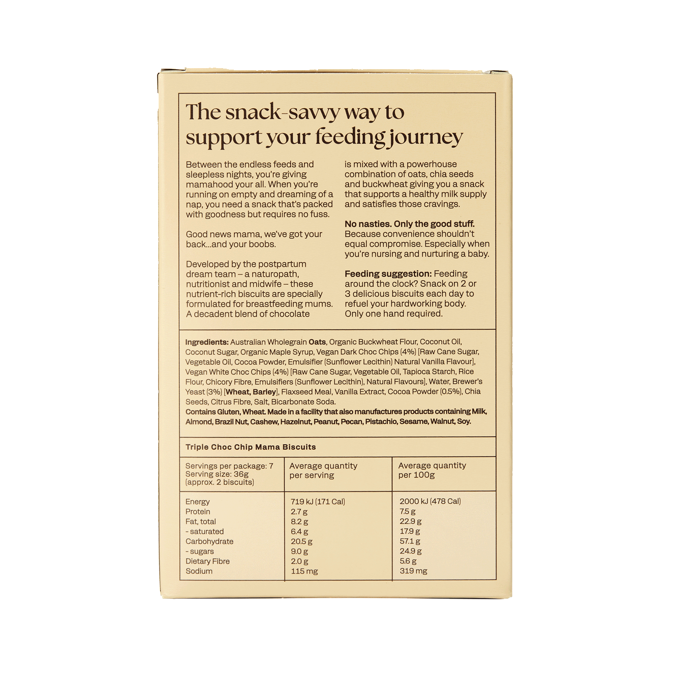 Delicious chocolate chips are blended with a powerhouse mix including oats, buckwheat and chia seeds to create a snack that will boost your energy and support your milk. Start snacking on these biscuits during late pregnancy and then continue eating 2-4 per day.