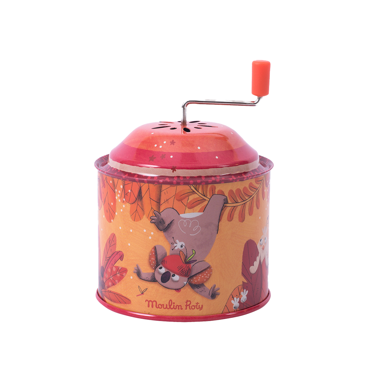 Launched in 2021 by Moulin Roty, this beautifully illustrated music box features Koco the koala and friends hiding between the leaves and vines, in shades of organges and reds. Little one can simply turn the handle to hear the melody of Chatanooga Choo Choo.